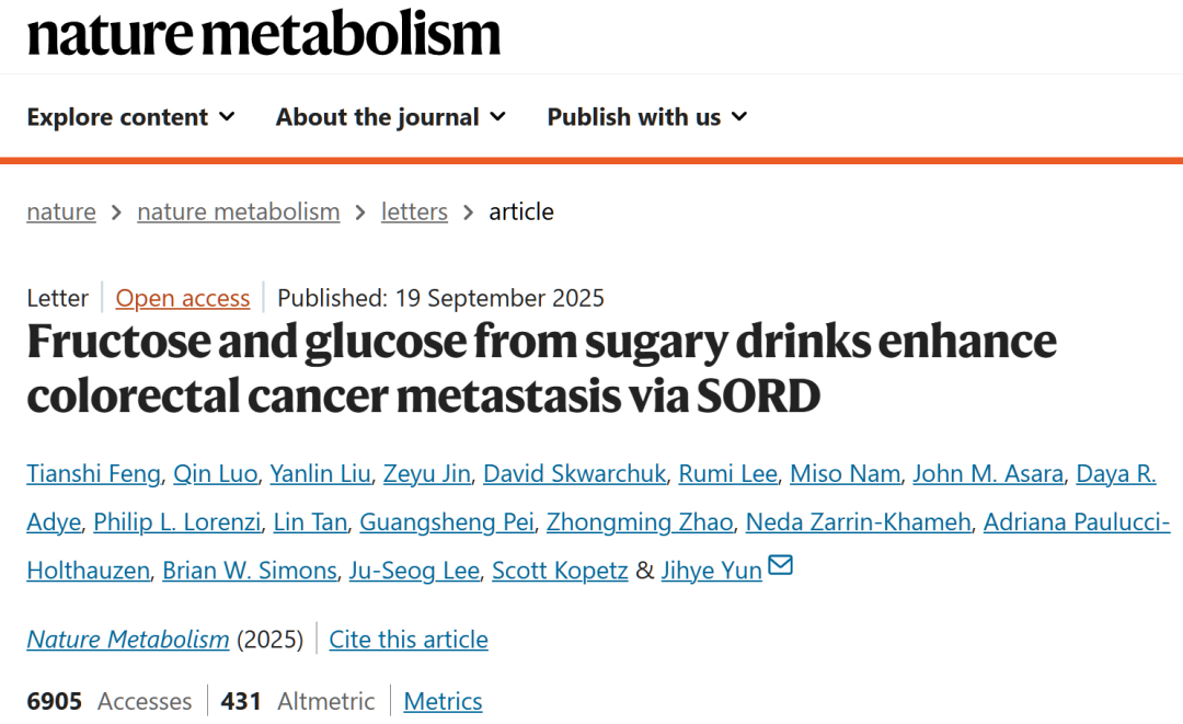 [1]Feng, T., Luo, Q., Liu, Y. et al. Fructose and glucose from sugary drinks enhance colorectal cancer metastasis via SORD. Nat Metab (2025). https://doi.org/10.1038/s42255-025-01368-w